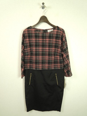 優しい色合いのピンク系タータンチェックと金具のジッパーがポイントの黒のスカートをドッキングさせたワンピースは女性らしさにあふれています!エレガンス度70%、フェミニン度30%。