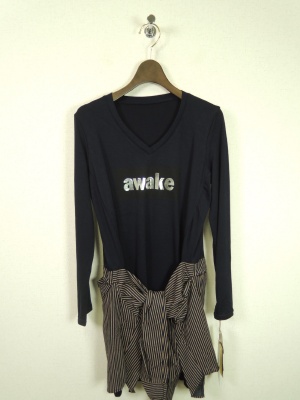 腰にシャツを巻いたように見えるドッキングワンピースは今すぐ着られる便利な一枚。レギンスに合わせてみました!アクティブ度80%、フェミニン度20%。