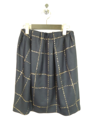 大人なネイビーコーディネート。ゴールドのウインドウペン模様のスカートでトレンド感出します。中のニットは肩のレース使いが素敵!エレガンス度70%、フェミニン度30%。