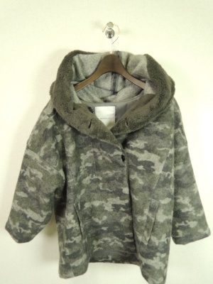 迷彩のスウェットパーカに素敵なビジュー付きプードルニット。スカートもニット素材の物を合わせてふんわりと着心地の良いコーディネート!フェミニン度80%、アクティブ度20%。