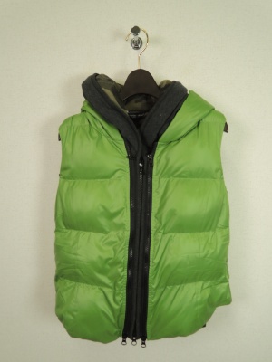 流行のミモレ丈をダウンベストで軽やかコーデに仕上げて。カーキ×ピンクの色合いで一段と軽やかに!フェミニン度70%、スタイリッシュ度30%。