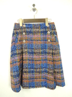 ツイードのスカートとの中の一色をニットにリンクしてモカ系の色の中に綺麗なブルーの色が鮮やかに映えるコーディネート!フェミニン度70%、スタイリッシュ度30%。