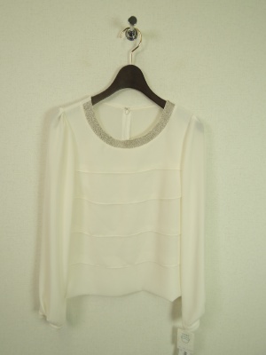 ボルドー×ホワイトでシンプルかつフェミニンな可愛らしさ表現。ネック周りに飾りのあるブラウスはアクセいらずで重宝しますね!フェミニン度60%、エレガンス度40%。