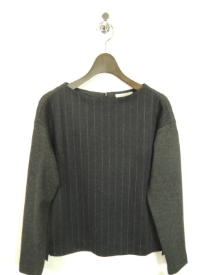 ストライプのセットアップ。縦のラインが繋がってスッキリした見え方でワンピースのようなシルエットになります。上品に着こなして冬のお出かけアイテムとして!エレガンス度70%、スタイリッシュ度30%。