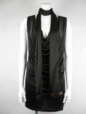 セクシーなドレープワンピで、カジュアルじゃないリッチなレイヤードスタイルに。上を羽織るならタイトなロングカーデを!エレガンス度70%、スタイリッシュ度30%。