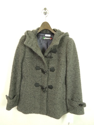 ケーブル模様が可愛くてお洒落なダッフルのミドル丈コート。ロゴニットとデニムのカジュアルスタイルに大人の優雅さが加わります!アクティブ度70%、フェミニン度30%。
