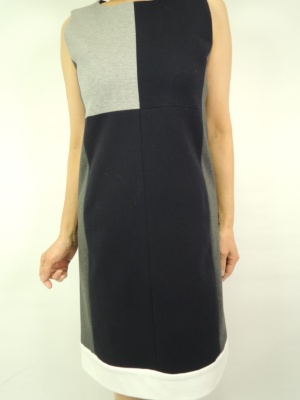 ストライプのジッパータイプのジャケットにはシンプルなワンピースでエレガントな着こなしに!エレガンス度70%、スタイリッシュ度30%。