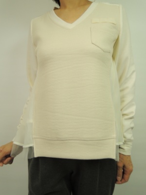 Vネックのシンプルなカットソーに見えるが裾にはポイントになるチュールが。タイトスカートで組み合わせるとスッキリした着こなしに!アクティブ度60%、フェミニン度40%。