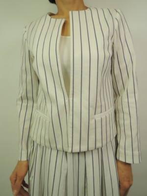 ふんわりボリュームの出るスカートはカットレース生地で今年注目です。ストライプのJKでコンパクトにトップスをまとめるのがコツ!フェミニン度60%、エレガンス度40%。