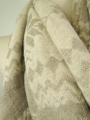 ボリュームのある大判ストールをふんわりと巻くと小顔に見える!アクティブ度80%、フェミニン度20%。