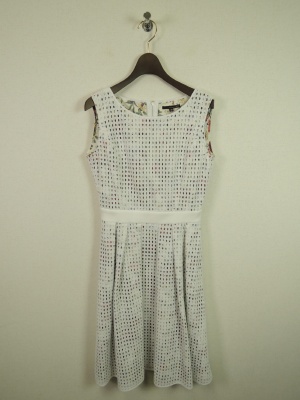 カットワークレースの下は花模様生地の2枚合わせ。チラッと見える花柄が白の面積を抑えてくれます!エレガンス度80%、フェミニン度20%。