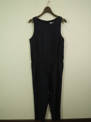 とろみの生地のオールインワンはウエストで絞るタイプ。ロングジャケットを羽織ってシャープな印象に!スタイリッシュ度70%、エレガンス度30%。