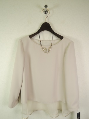 光沢感のティーパードパンツとオーガンジーのブラウスでエレガントな装いになる。パンツ派の方のパーティーファッションにお薦め!エレガンス度90%、スタイリッシュ度10%。