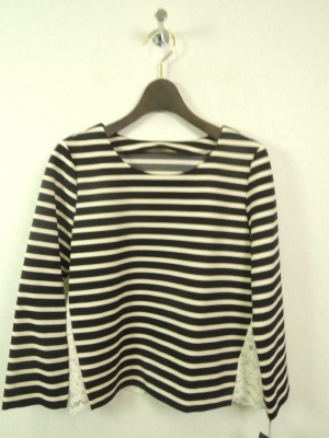 ボーダーはいつのシーズンも健在ですね。後ろレースがフェミニンですね。二重に巻いたストールをアクセントに!アクティブ度80%、フェミニン度20%。