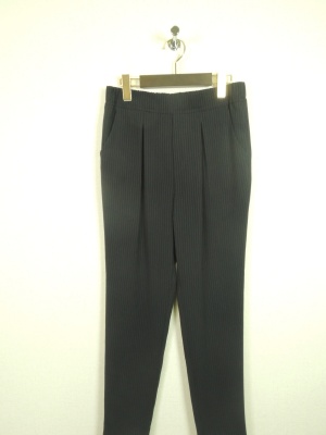 細身のシルエットと長めのロング丈。パンツもストライプで縦に長く見えるようにサラッと羽織るだけで動きが出る!スタイリッシュ度90%、エレガンス度10%。
