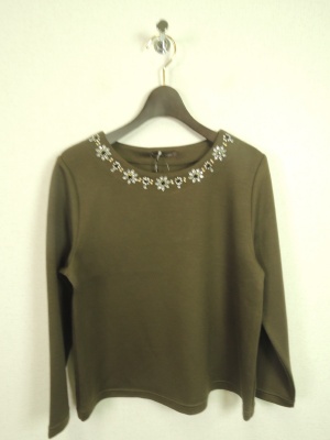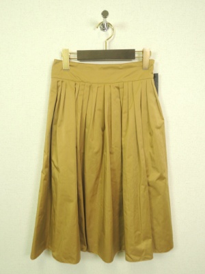 ビジュー付きのカットソーとふんわりスカートの組み合わせ。トップスをインして下にボリュームをだして可愛く着こなす!フェミニン度80%、エレガンス度20%。