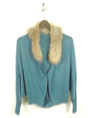 ファー付きボレロカーデ。ガウチョパンツが良く似合う。ブルーグリーンとキャメルとの相性もOK!フェミニン度70%、スタイリッシュ度30%。