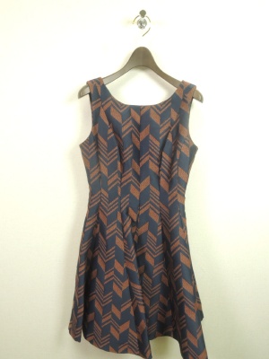 幾何学模様のワンピース。ウエスト部分からスカートにかけてボリュームを出したエレガントなデザインが特徴!エレガンス度90%、フェミニン度10%。