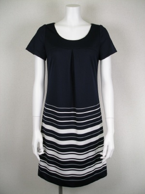 白のジャケットにネイビーのワンピースでマリン気分。差し色のバッグは赤もいいけどグリーンも爽やかです。スタイリッシュ度70%、フェミニン度30%。