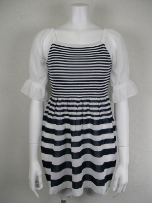 ボーダーニットもこんなシフォン使いのタイプなら少しガーリーな印象。ボトムはサルエルパンツにすると、甘さ控え目に!アクティブ度80%、フェミニン度20%。