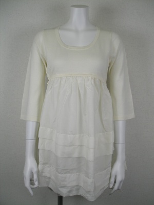 二枚合せのスカートを白のニットでコーディネート。ヨークから下がやや光沢のある素材で、スカートとの繋がりができます。ワンピースのような着方をご提案!エレガンス度80%、フェミニン度205.