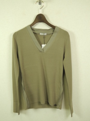 上下のべランスを淡い色で統一。ベージュとカーキの コントラストが大人のカッコよさを表現してくれます。 V字の開き具合がデコルテ部分をすっきり見せてくれます。 あえてアクセサリーではなく、ストールをつけてみました。 ネイビー色が全体をグッと引き締め てくれます。
