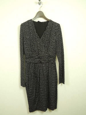 シネカノンは生地やデザインに大人の魅力が詰まっています。 今回著供養したワンピは黒字に小紋柄で落ち着いた印象で、 カシュクールのデザインが胸元を綺麗に見せてくれます。 裏地はありませんが、インナーを着用しなくても下着が見える心配もございませんので ご安心ください。スカート部分はラップ風で裾にかけてすぼんでいるので 身体のラインをとてもきれいに見せてくれます。 同じシネカノンのカーディガンと合わせてみました!