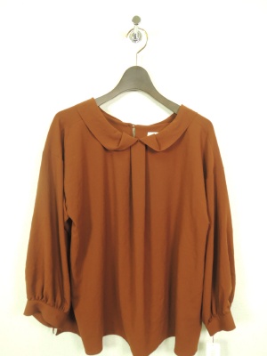 襟の部分が普通と違って、少しデザイン性のあるものでワンポイントに。 トロミのある生地で上下合わせる事によって全体的に優しい雰囲気に。 スカートっぽく見えますがボトムスはパンツを合わせて動きやすさを重視!