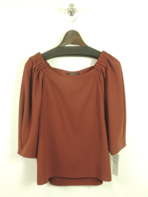 黒のフェイクレザーのスカートは少しクールなイメージが強くなりがちですが Aラインんのシルエットで女性らしさが出ます。 トップスに流行色といわれるボルドーを合わせました。 こちらのボルドーのブラウスは本来セットアップになっていますが 今回はあえて 別々でコーディネートしてみました。 秋一番に着て頂ける7分袖で少し裾が広くなっています。 ブラウスをスカートにインして着るとお袖部分がワンポイントになって良いですね!