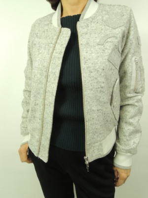 トラッゾドンナのニットとアッシュローブのスカートとのフェミニンな合わせに パシオーネのプラスブルゾンを羽織るだけで グッと引き締まったコーディネートになる。 着こまず羽織る感じのルーズさがこのコーデのポイント!
