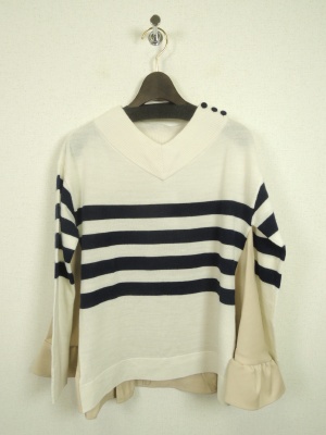 異素材組み合わせのソーノのニット。 後ろのフリルがオシャレのポイント。 ブラーミンの細デニムで合わせるのが一番です。 デニムファッションも少しお洒落したい。 そんな時におすすめの一着です!