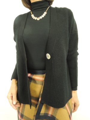 一つボタンのゆるデザインカーデが ボレロのような感覚でさっと羽織ってサマになる。 今回は台形スカート+シンプルカットソーの 上に合わせてみました!
