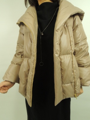 シンプルなサックワンピースは着るとシルエットの美しさにびっくりする。 ファスナーもボタンもなしだが裾を絞ったデザインは 思ったより細いシルエットでオシャレな一着。 ショート丈のジャケットでお出かけコーデの出来上がり!