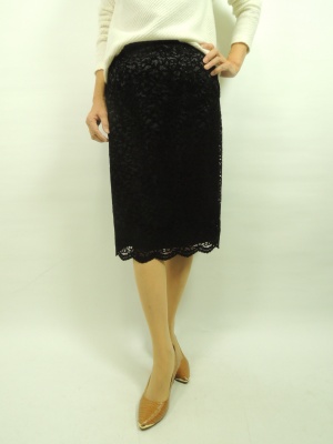 レースタイトスカートに白のカットソーを合わせました。 ドロップショルダーののトップスを合わせるにはフロントインしていただくと バランスが取れて綺麗です。 タイトlスカートで膝下の丈のスカートです。 レースの下の部分が光沢があるので よりエレガン トに見えます。光沢があることにより 黒色が重たく見えずトップスの白色ととてもよく合います!