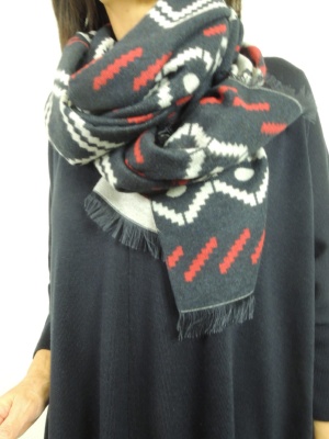 気取らないリラックス感のあるニットワンピースは 着こなし一つで表情が変わります。 今回は幾何学模様の大版ストールで首回りにアクセントをつけました。 首回りに目線を持っていくと ザックリしたニットがオシャレに着こなせます!