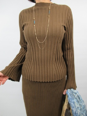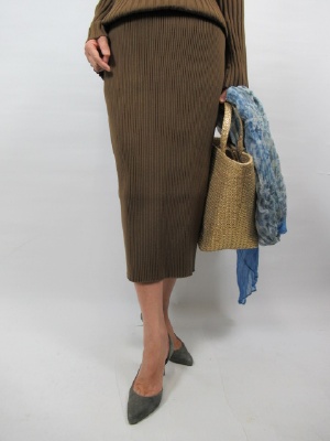 セットアップは秋から人気シリーズですね。 その中でもニットも注目です。 スカートは膝下のタイトスカートです。 リブ編みの上下ですが、 リブの巾がトップスの方がワイドリブになっているので セットアップで着てもメリハリのでるコーデとして楽しめますね !
