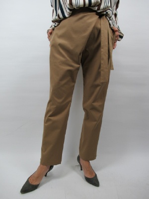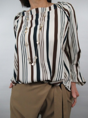 今年はウエストをマークしたり リボンのベルトなどが流行っています。 テーパード型なんてすが、フロントが重なるシルエット。 サッシュリボンは片方に寄った変形デザインです。 トップスは色を合わせてストライプのゆるシルエットブラウスを 組み合わせてみ ました!