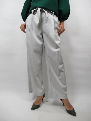 ウエストマークするシルエットがこの春のトレンドになっています。 タック入りのパンツのウエストをギュッと結ぶことで メリハリのあるシルエットが生まれます。 トップスはこちらも流行のボリューム袖で ワンポイントはちょっとだけフロントインすること。 これによってよりメリハリがつきます!