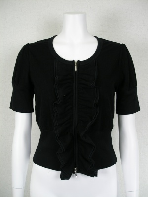 短い丈のカーディガンをチュニックに合わせてみました。ヨークの切り替えがとても可愛いですね!フェミニン度100%。