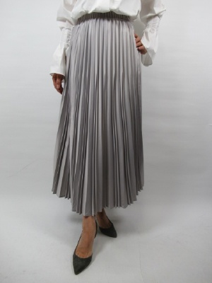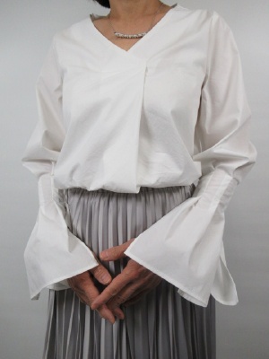 プリーツスカートは女っぽさが十分発揮できる一枚。 足元を気にせず動きやすいのも 一つの要素ですね。 シルバーグレーの光沢感が春の日差しに映えて 動くたびにキラキラして心も軽やかに。 白のブラウスはトレンドのボリューム袖スタイルで!