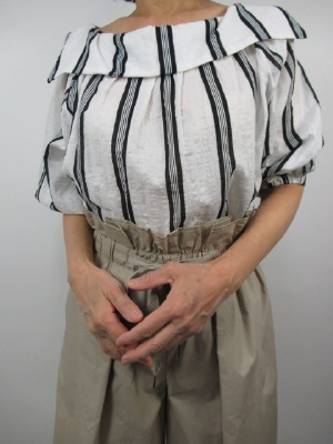 マリードール同士で上下合わせてみました。 ストライプ柄の丈長シャツブラウスは 細身のパンツでも安心して合わせれます。 今回みたいなワイドパンツでも 全体にインしたらとてもスッキリ見えます。 襟元は変形セーラカラーになっていますが 下着が見える ほど首回りも開いていないので安心です。 ウエストマークのワイドパンツはゴムになっていてリボンで調整できます!