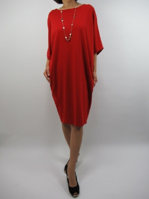鮮やかなワンピースはコクーン型の生地。 カットソー生地で着心地の良い一着です。 シンプルゆえにあえて 小物を上手く活かすコーディネートにしたいですね!