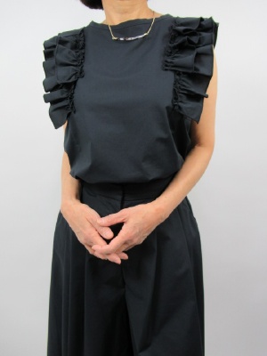 パンツと袖フリルのブラウスのセットアップです。 ブラウスは後ろにポイントを持たせた一着。 パンツはスカートに見えるデザインで 裾広のデザインです。 綿100%ですがサラッとした生地で 少しストレッチ効果もあるので とても着やすいです。 嬉しいことにウォッシャブルなので 夏のお出かけも安心ですね!