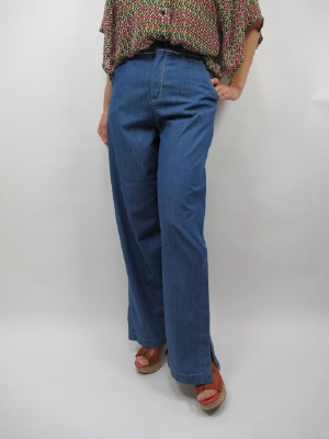 ダンガリー素材の柔らかい生地感のバギーデニムは 今から真夏に向けてご利用いただける商品です。 裾のスリットがとても涼しげに感じられるデザインで シフォンのブラウスととてもよく合います。 マルチカラーのブラウスなのでこういった シンプルなボトムス に合わせると とても明るい雰囲気になります!