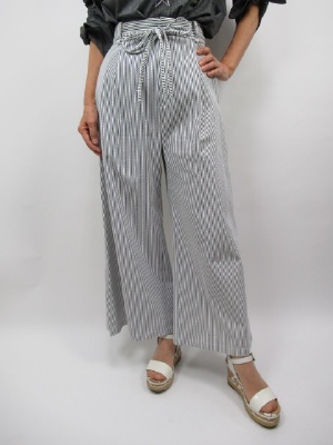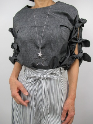 ソーノのブラウスはお袖が3つのリボンで とても可愛いデザインですが お色がチャコールグレーなので可愛くなりすぎません。 お袖は間があるので少し腕の部分が見えますが 腕が少し見えることによって軽く見えます。 合わせたパンツはストライプのワイドパン ツで 共ベルトが付いています。 細いストライプ柄なので明るい印象になります!