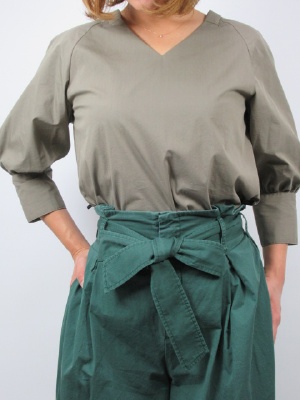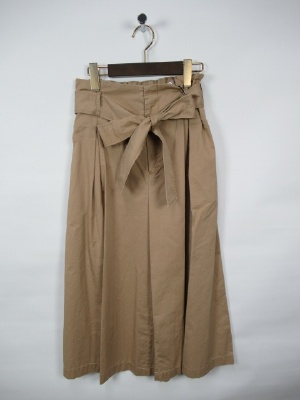 新作のスカーチョタイプのパンツはウエスト部分が共リボンでサッシュベルトの様に メリハリがついて引き締めてくれます。 裾部分にかけて広がっていますので スカートの様にも見えてとても可愛いデザインです。 合わせたトップスのブラウスは後ろに特徴があり 背中の部分がレースアップになっています。 中に一枚必要ですがそこまでインナーが目立たないので 合わせやすいです。カフスが少し長めのふんわり袖なので ボトムスにインしました!