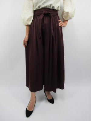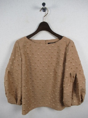 ヌークのフロッキー生地がとても好印象なブラウス。 ホワイトとキャメルの2色展開です。 袖の切り替えから袖口にかけてボリュームが出ていて 女性らしいシルエットになっています。 パープルのパンツと合わせてみました。 スカートの様に見えるパンツは揺れ 動く感じが とても素敵で共布のベルトが付いているので 今年らしい雰囲気になりますね!