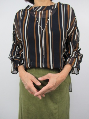 | スタイリッシュ・モダン (ストライプシャツを使用したONスタイル)ストライプのフリルブラウスにネイビーのジャケットカーデとワイドパンツを合わせた上品なセットアップコーデ。程よいフリル使いがきちんとした中に女性らしさを添えます。落ち感のあるパンツですっきりとした縦ラインを演出。お仕 事からお出かけまで幅広く活躍するスタイリング。大人の品格を感じさせる洗練された装いです。 | |