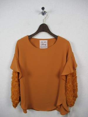お袖がとても印象的でオシャレなブラウスをご紹介します。 フリルとその下がボリューム袖になったタイプのブラウスで お色が他にマスタードと黒の3色展開です。 着丈は少し短めでワイドパンツなどにも合わせやすいタイプです。 今回はアッシュローブのイレギュ ラータイプのスカートと合わせ サッシュベルトでメリハリをつけてコーデしました。 スカートはラップ風になっていますので、中が見える心配はありません。 揺れ動くシルエットがとても素敵です!