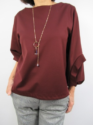 ブルーベルの新作アイテム、ボルドーのブラウスは お袖の部分がフリルをあしらったデザインでお袖にゴムが入っています。 少したくし上げて着るとフリル部分が強調されて ファッションを楽しめます。 今季人気のグレンチェックのパンツと合わせた やや緩めの シルエットなので ヒールと合わせるとバランスがとりやすいです!